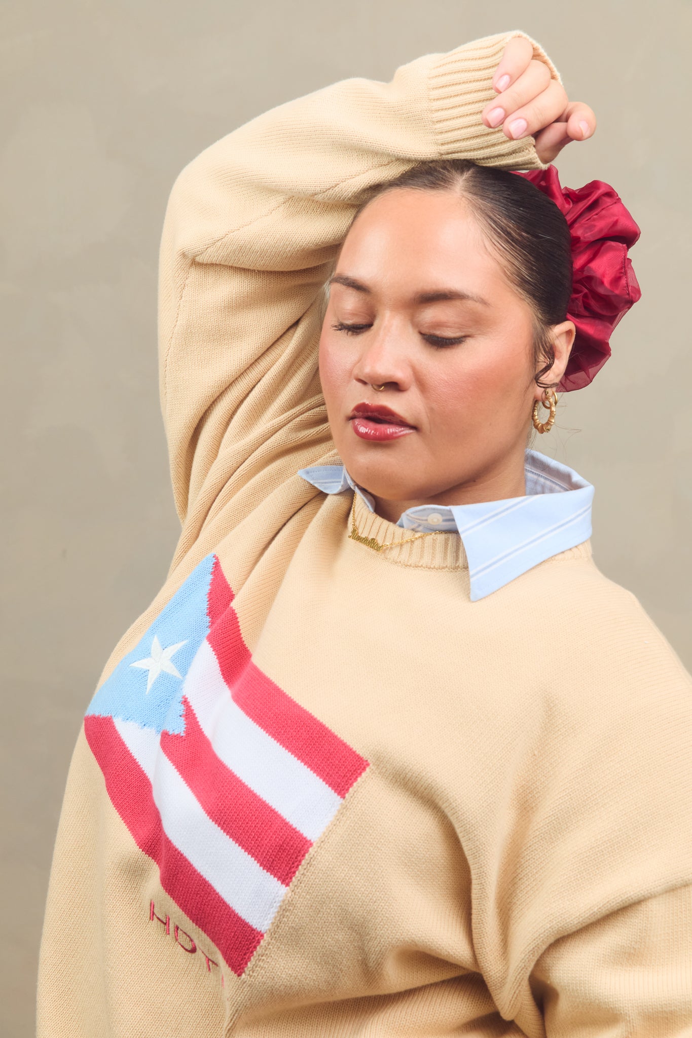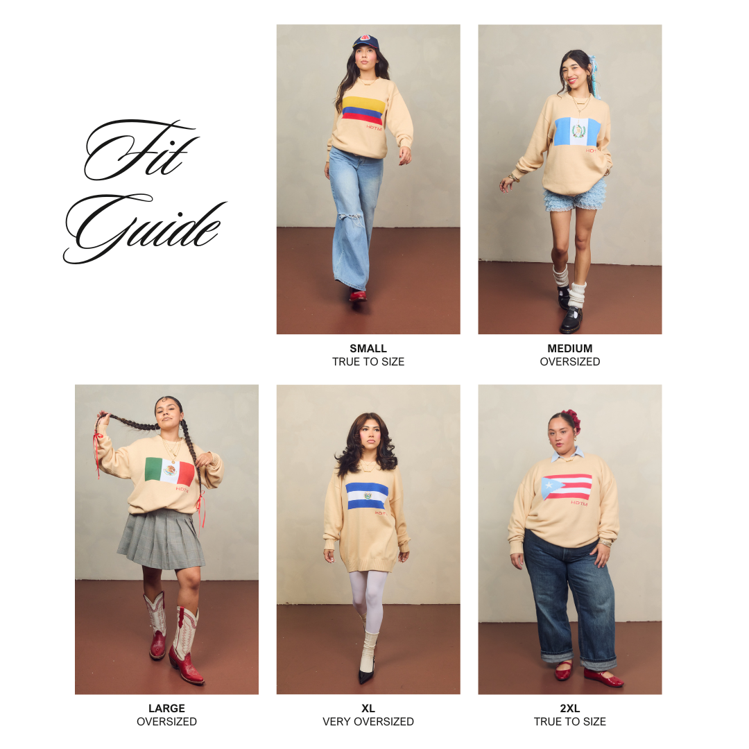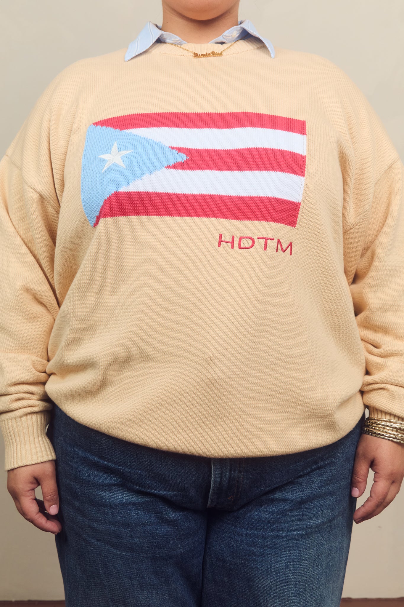 This cream-colored sweater features a bold Puerto Rico flag detail and embroidered accents that celebrate home.