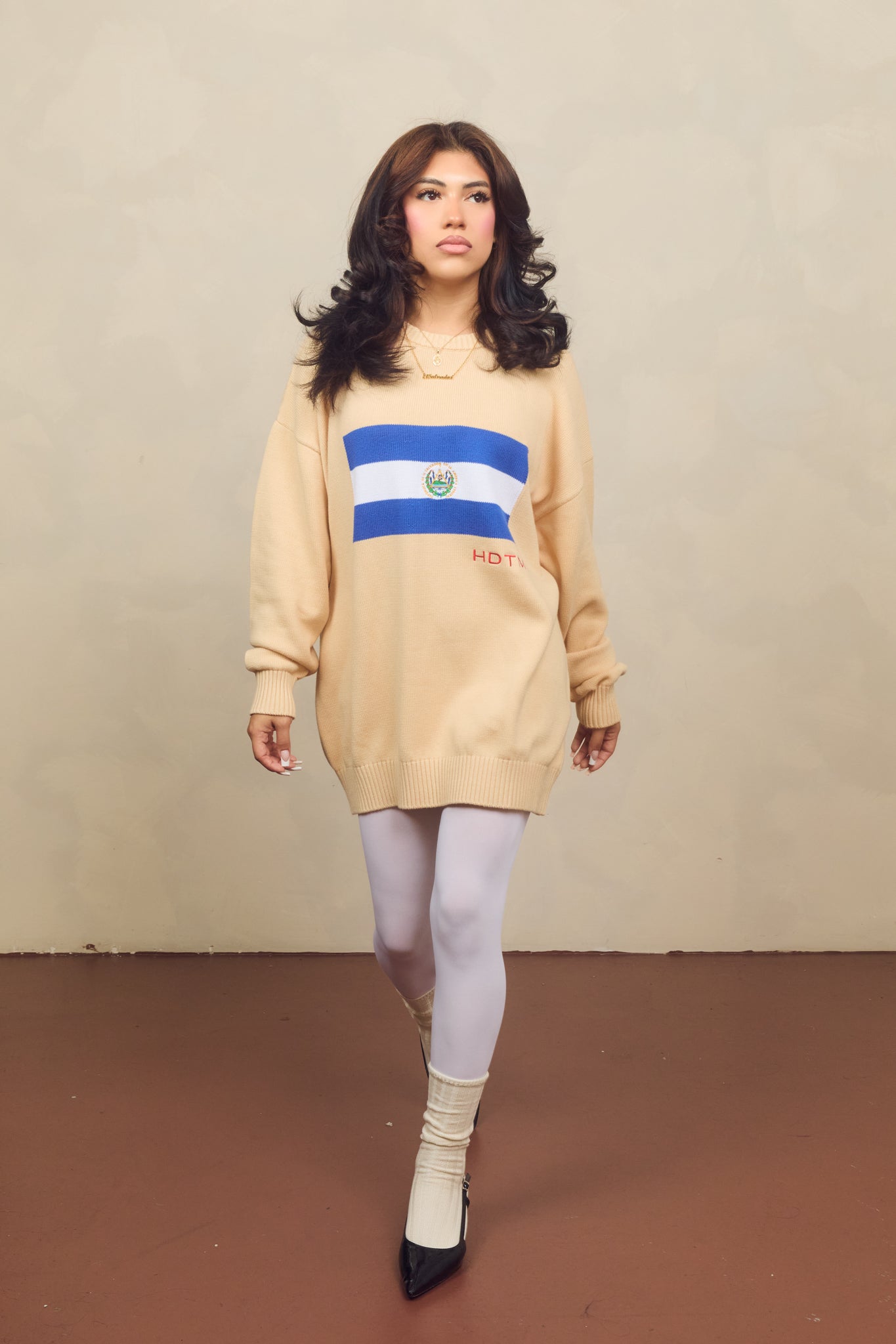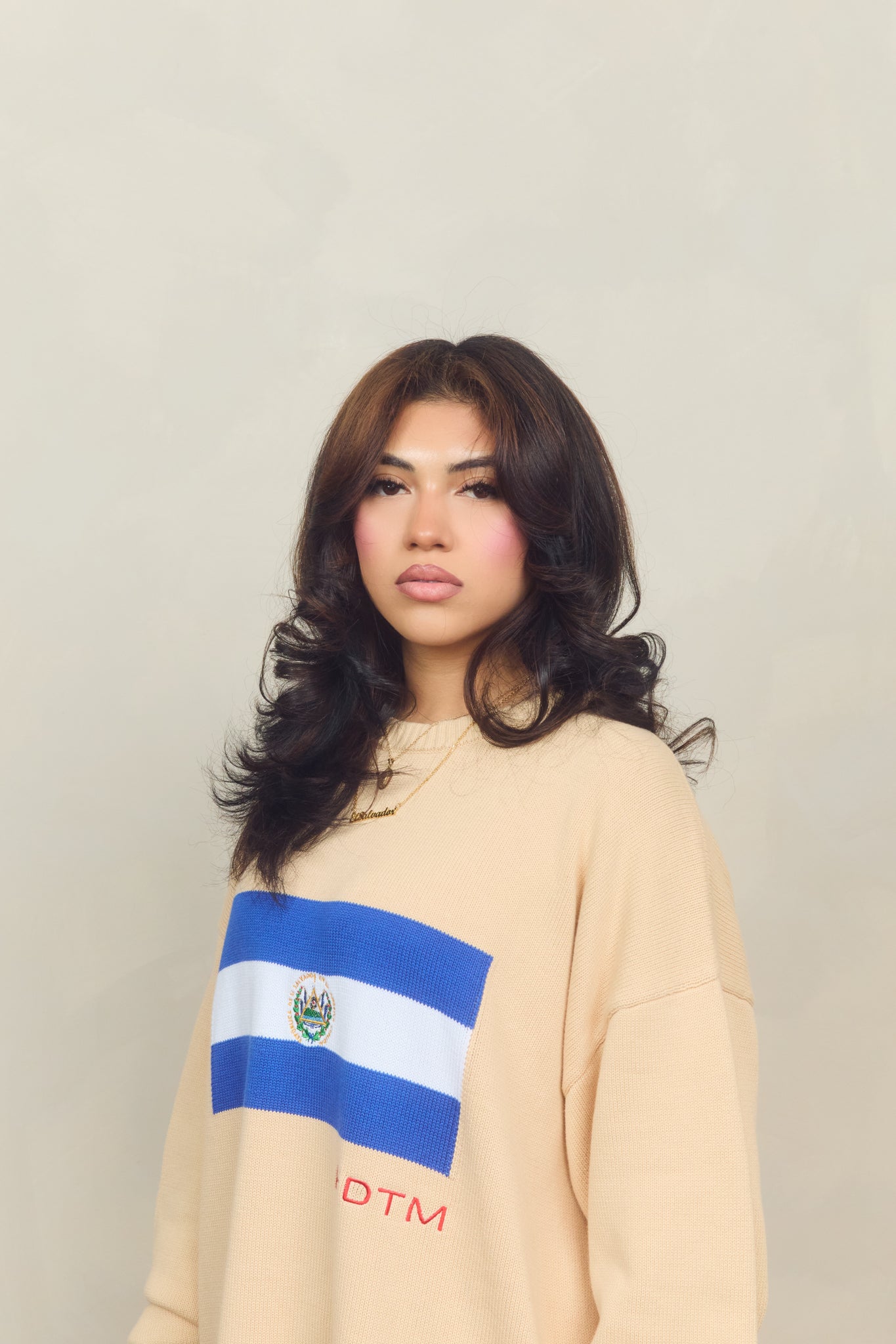 This cream-colored sweater features a bold El Salvador flag detail and embroidered accents that celebrate home.