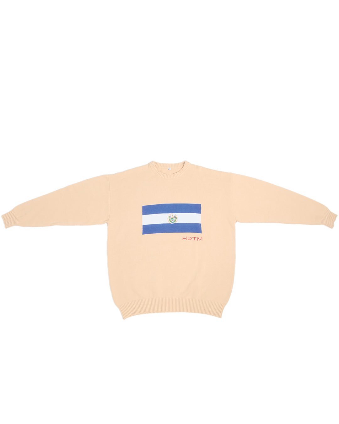 This cream-colored sweater features a bold El Salvador flag detail and embroidered accents that celebrate home.